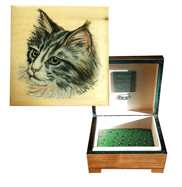 Custom art work is adorning the top of this hardwood cherry or maple box . The artwork is created from your favorite photo as reference.. The box is then lined in playful cotton print , or your choice of colors( Wine , Royal blue or dark green) in a suede or velveteen fabric.